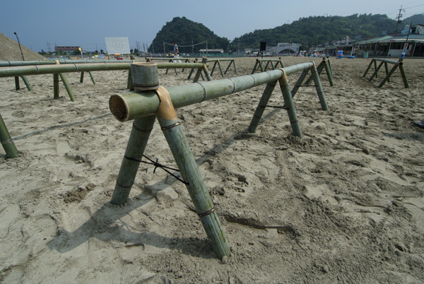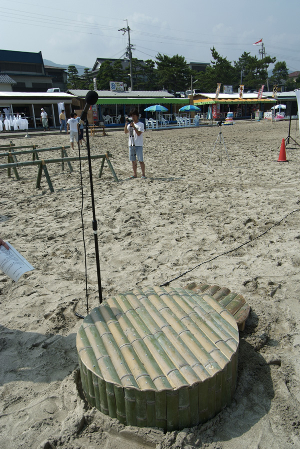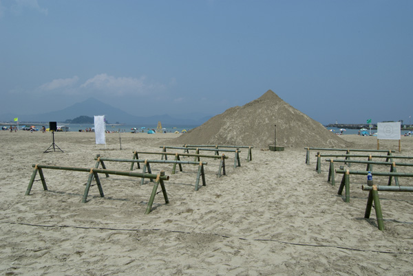 白葉山の前にある竹製の演台は、和田浜から眺めると青葉山と城山との関係に似ていると思いませんか?白い砂浜に青竹がコントラストよく映えています。