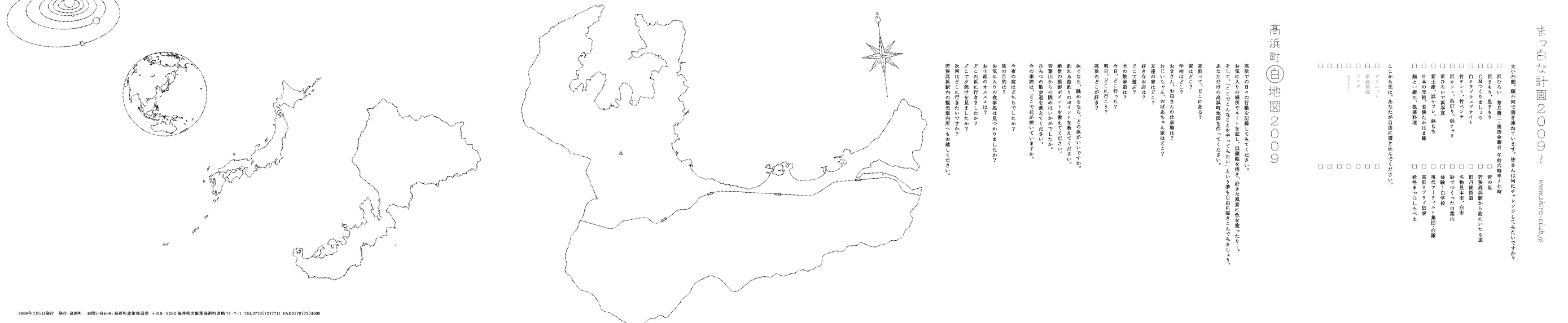 白地図は、高浜町が世界のどこにあって、どんな魅力を持った町なのか?を再び知るための地図です。使い方は、既に書いてある様々な問いかけに答えていくのもいいですが、この白地図を、あなたのオススメや好みで一杯にして、あなただけの高浜地図をつくって欲しいと思っています。高浜町の魅力はどこでしょう?ぜひ、私たち白クラブにも教えて下さい。
