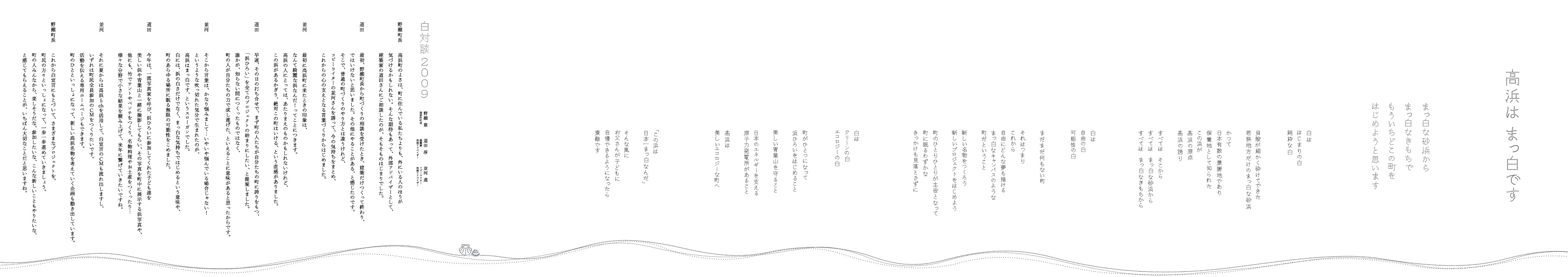 表紙やポスター同様に、砂粒から、イメージを膨らませていったアートワークが清々しく可能性を感じさせ、カワイイ輝きを放っています。後半は、「白対談2009」と名付けた、野瀬町長と外部ADの道田、並河による、浜ひろいに辿り着いた理由や、これからの豊富が対談形式で掲載されています。