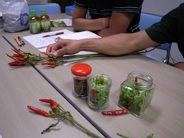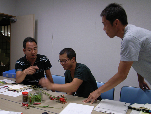 この日は現物を見ながら意見交換です。鮮やかな緑色を維持した乾燥の仕方を模索し、、パッケージを考え、、赤唐辛子と緑唐辛子をかじり比べてみました(辛!)。緑は、赤に比べると熟成してない分、辛さの深みには欠けますが、爽やかで突き抜ける刺激が口の中を駆け抜け、印象的で、十分商品になりそうです。唐辛子を出荷するだけでなく、直接、商品として売られるように皆で知恵を絞る、高浜での楽しみが一つ増えました。