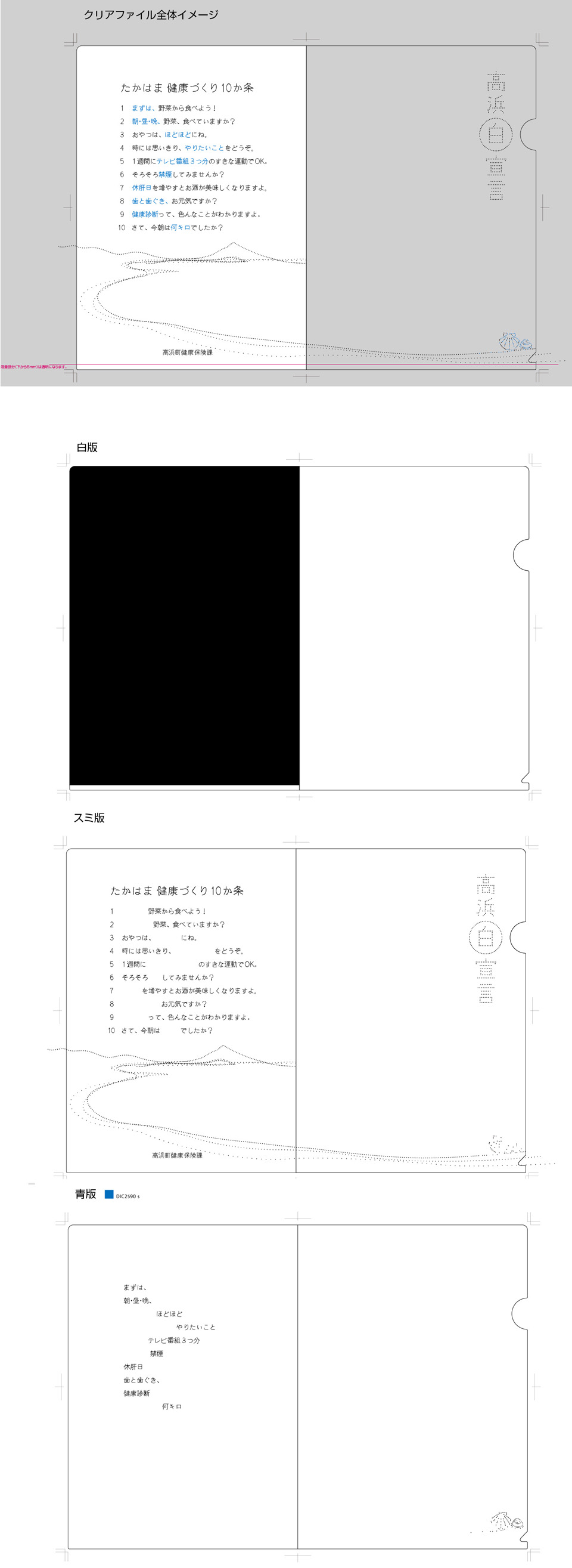 さて、少し前に思いがけず高浜町保健課から相談を頂き、「高浜町健康増進計画」の周知計画に参加させてもらいました。保健課の皆さんが、時間をかけて考え抜かれた10か条を、内容はそのままに、より親しみ易くなるよう書き直し、周知グッズとしてクリアファイルのデザインを田中偉一郎さんにしてもらいました。大事なメッセージが、より伝わるよう模索する、これも一つの” 白宣言 ”です。