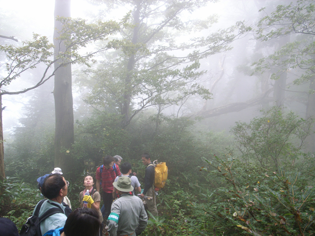 この日の天候は曇りで気温は申し分無いものの、ふもとから見れば頂上には霞がかかっています。それでも総勢15人、皆さんほがらかに絶景を期待してのスタートです。杉の木立に様々な植物が生い茂る急な山道を登りながら、所々で休み、山野草についての説明を聞くのですが、これがなかなか楽しく、あっという間に登頂しました。