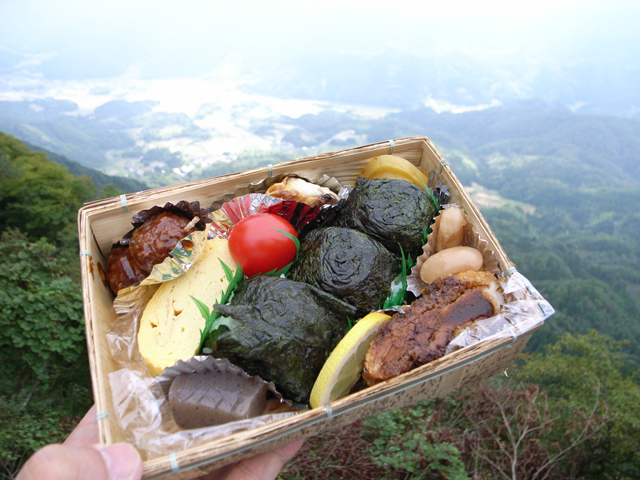 一方、南側の小浜線がある方は、終始、よく見渡せて気持ちがいいので、めいめい好きな場所に腰を下ろして、弁当を広げます。私も崖の上に座り、特製・秋岡屋弁当を頂きました。しかも昼食後は、ゴザを敷き、野点(お茶のお手前)をいただくなど至れり尽くせり。(まちづくり課・河合サン、荷物重そうでした。ご苦労様でした。)