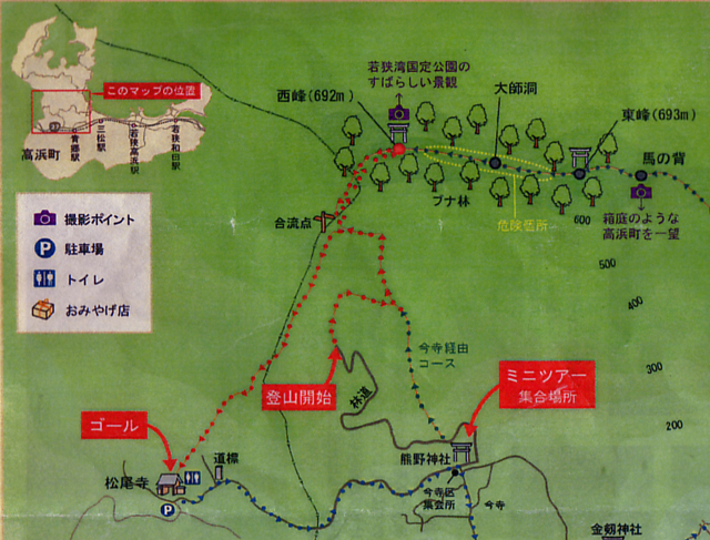 仮に海側を正面とすれば、頂上は一つに見えますが、側面から見れば3つの峰が重なり合っています。そのうち一番低い西峰(692m)に、高浜歴19回目にして初めての登山です。いくつかあるルートのうち、今寺をスタートとし、登頂した後は、77年ぶりに馬頭観音がご開帳中の松尾寺をゴールとする、一番短く、しかし険しく、でも楽しいコースを登ります。