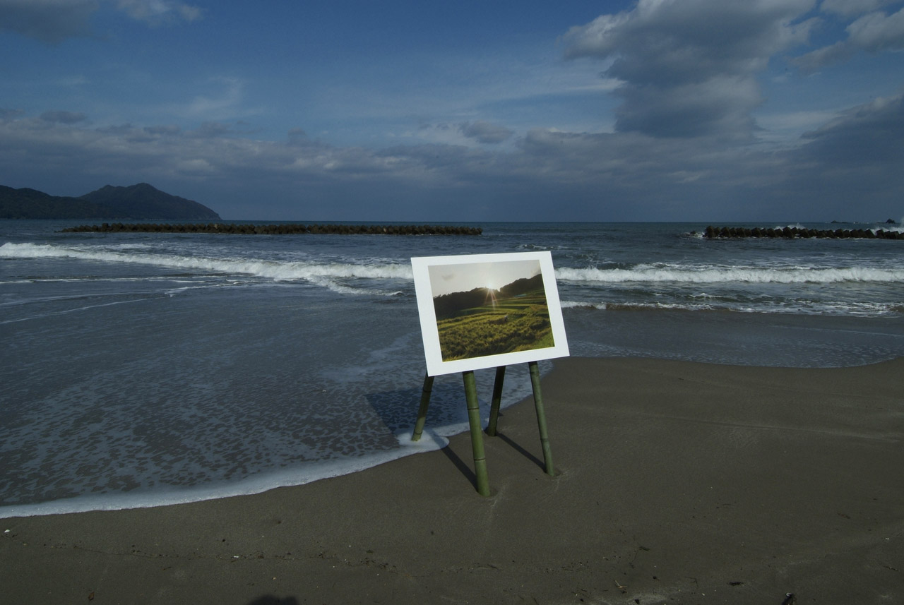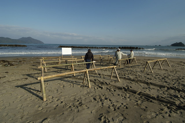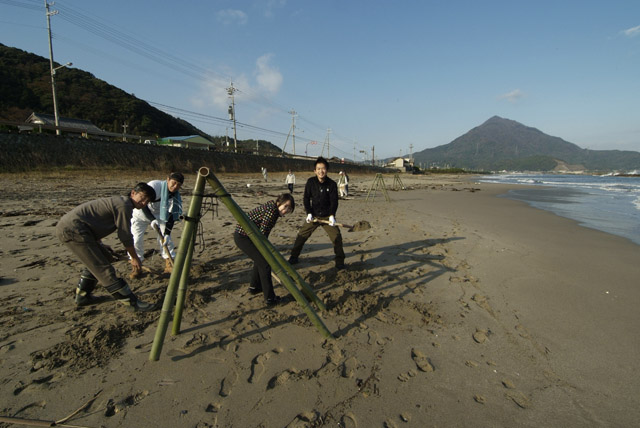 本来の姿に戻った浜で、青竹に支えられ立つ、美しい写真。