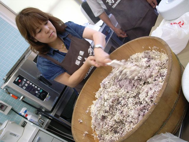 松村さん、炊きあがったご飯に麹を混ぜてはります。