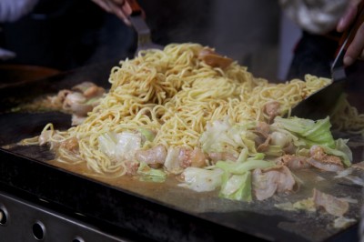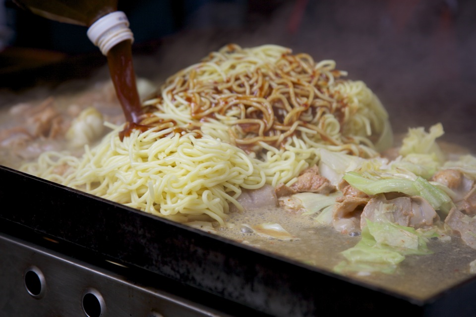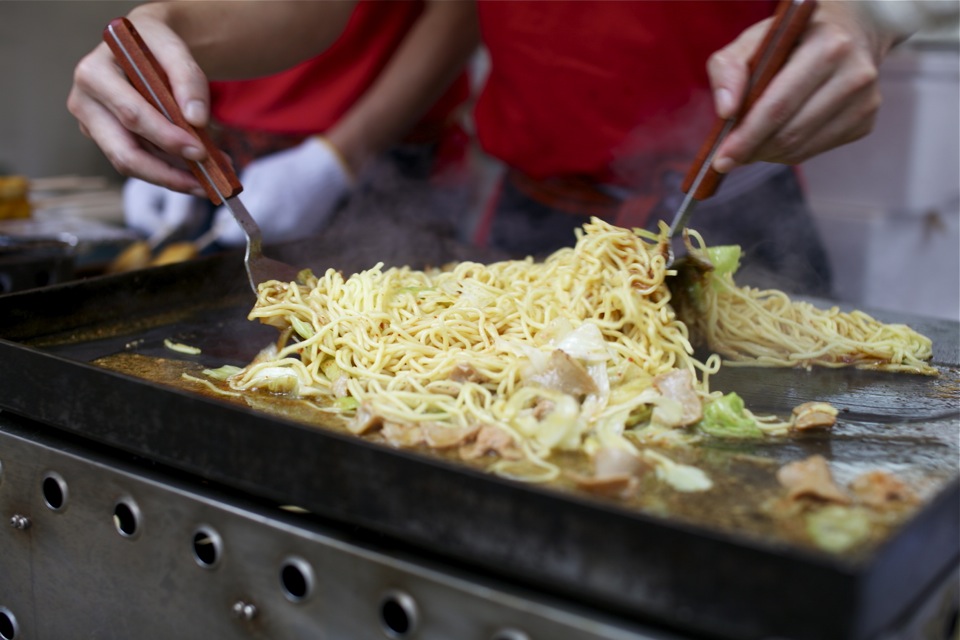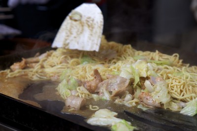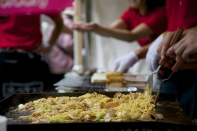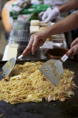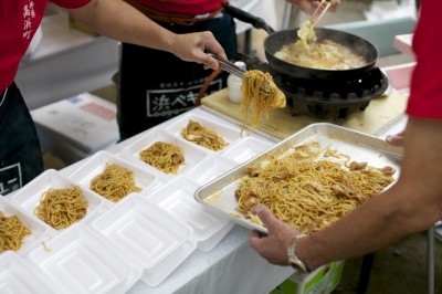 青空の下で爽快に焼かれる焼きそば!