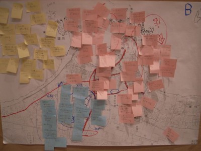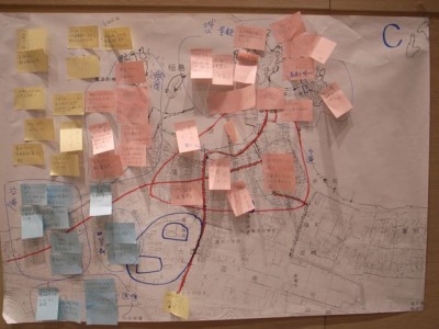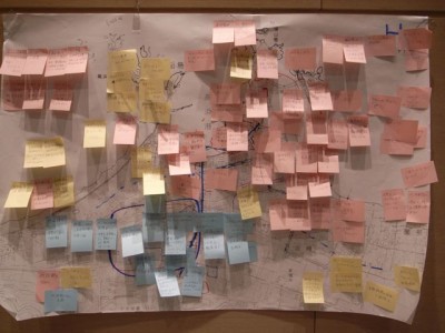 壁に全ての地図を貼り出して、全員で他のテーブルの結果をみます。