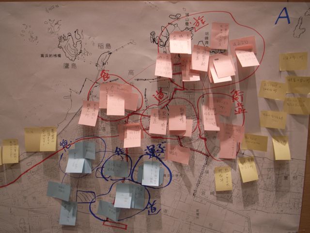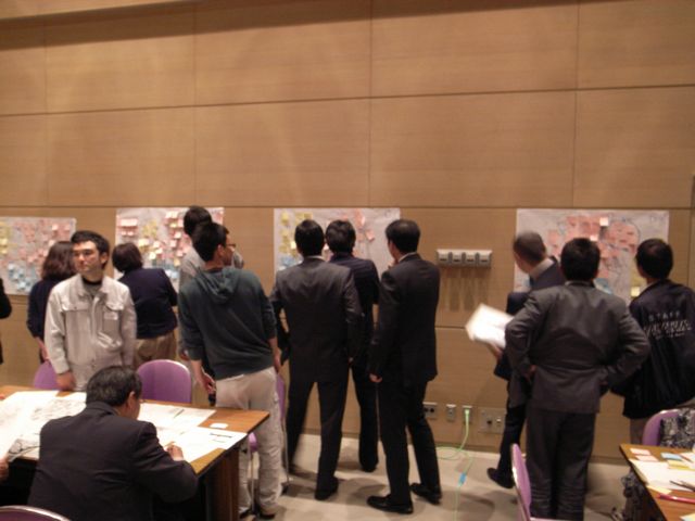 壁に全ての地図を貼り出して、全員で他のテーブルの結果をみます。